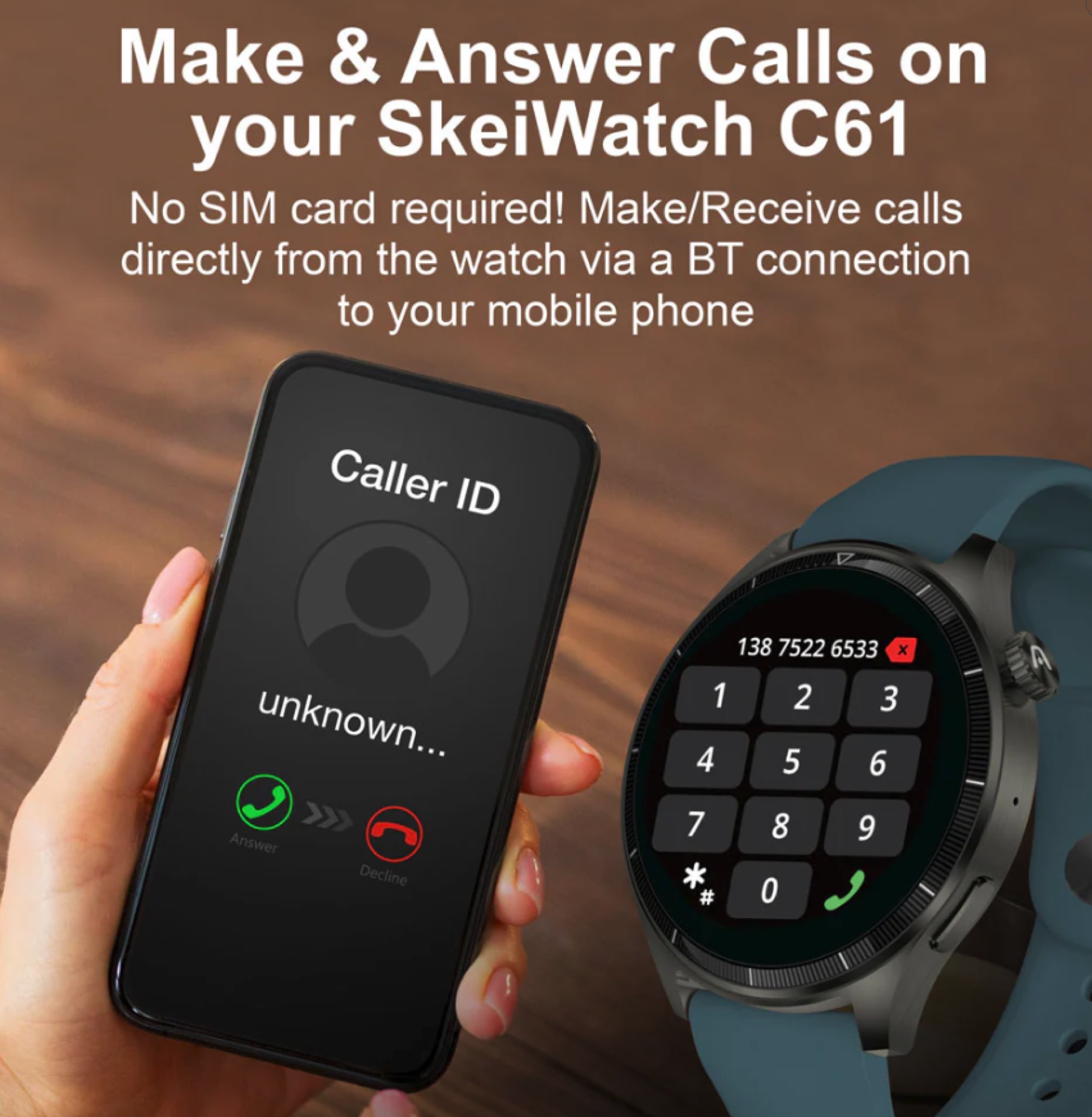 Este dispositivo avanzado incluye un sensor de frecuencia cardíaca, monitorización de la presión arterial, monitorización del sueño, monitorización del estrés, medición de oxígeno, podómetro y monitor de actividad física, entre otras funciones. También puedes gestionar las llamadas entrantes directamente desde el reloj con controles de sonido y vibración integrados. El C61 incluye una función SOS para mayor seguridad y ofrece actualizaciones de stock, reloj mundial y la opción «Buscar reloj» para ayudarte a localizarlo.