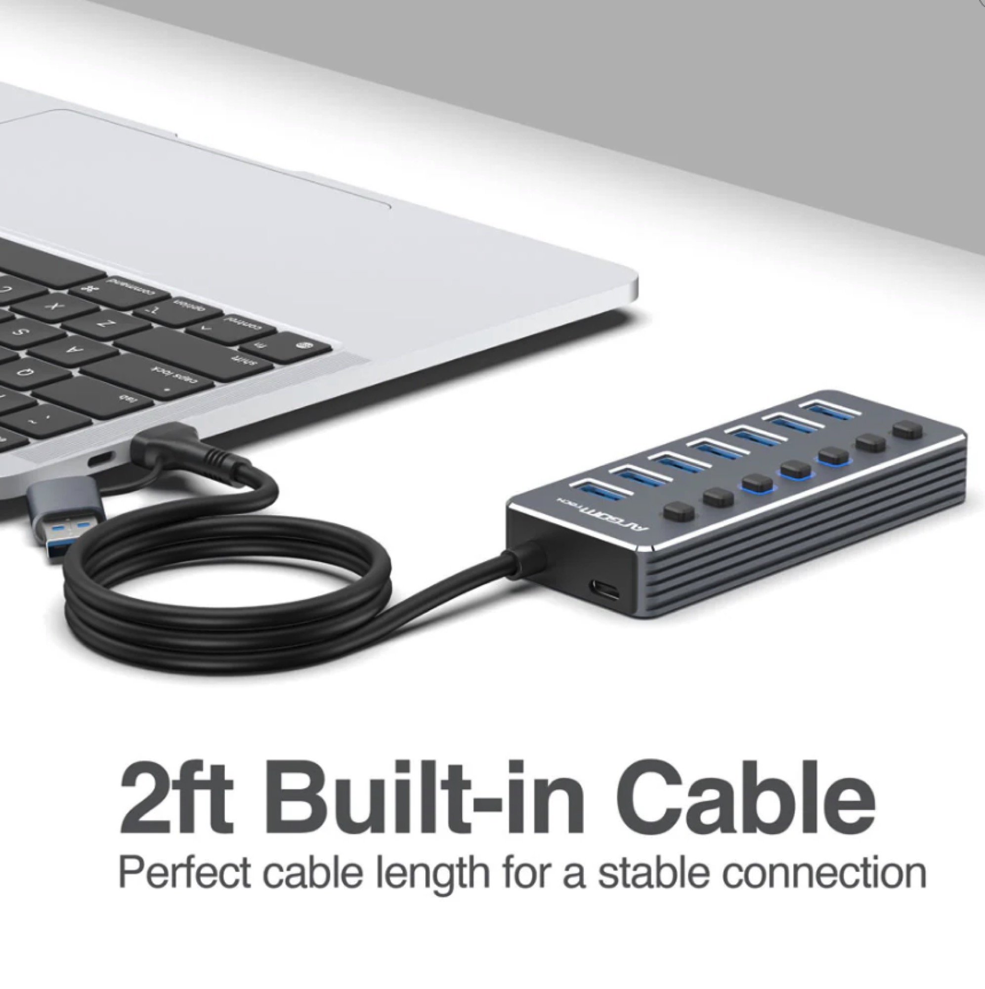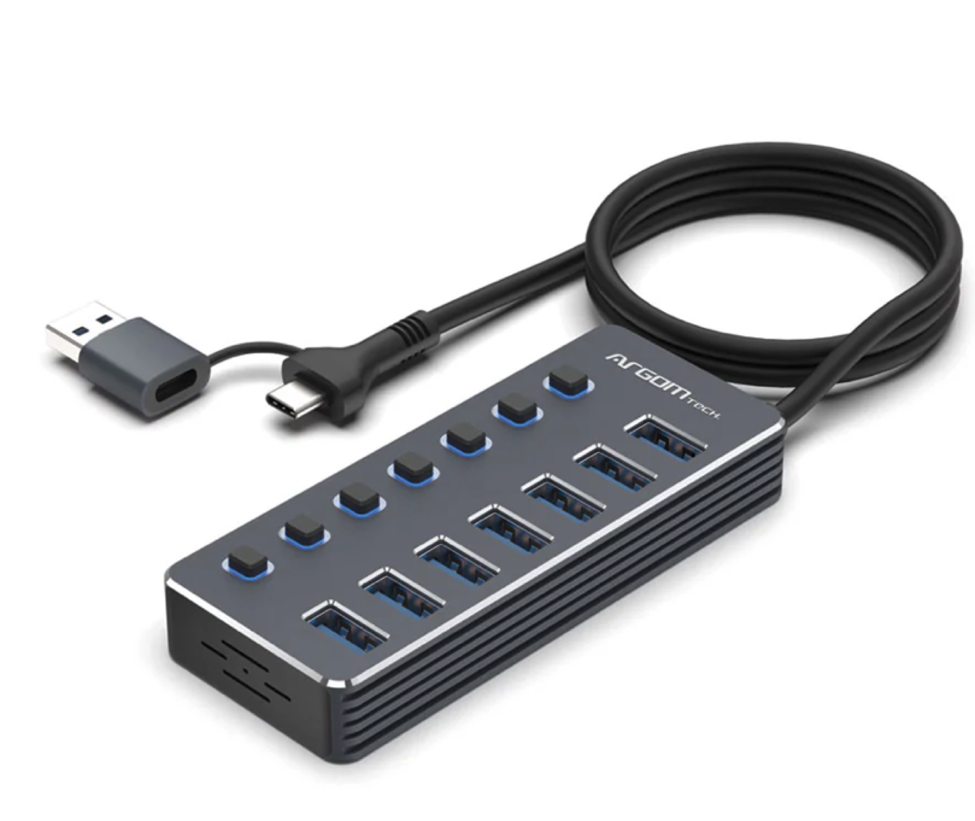 Mejore la conectividad de sus dispositivos con este concentrador 2 en 1 Tipo-C/USB 3.0, con siete puertos USB 3.0. Cada puerto cuenta con un interruptor de encendido/apagado con indicador LED, lo que le permite gestionar la energía y el flujo de datos de forma eficiente.