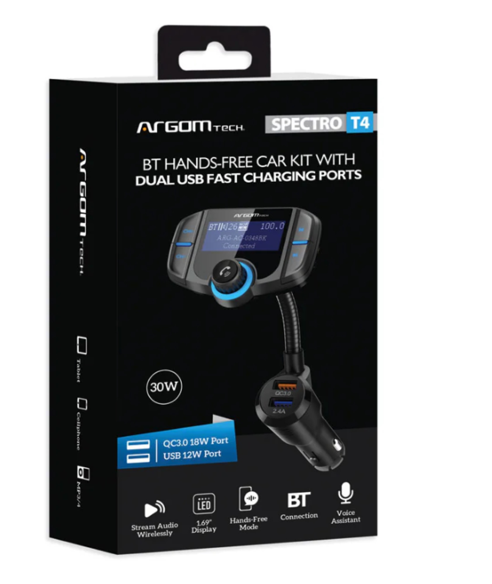 Nuestro kit de manos libres para coche Spectro T4 BT le permite transmitir audio y llamadas directamente desde su dispositivo BT al sistema estéreo de su coche. El BT V5.0 integrado le proporciona una increíble función de manos libres y cuenta con dos puertos de carga rápida (USB 12 W y QC3.0 USB 18 W). Equipado con una pantalla LCD fácil de leer y un brazo flexible para ajustar el mejor ángulo de visión. Además, cuenta con una ranura para tarjeta TF y un puerto de entrada/salida de línea para transmitir su audio MP3 favorito.