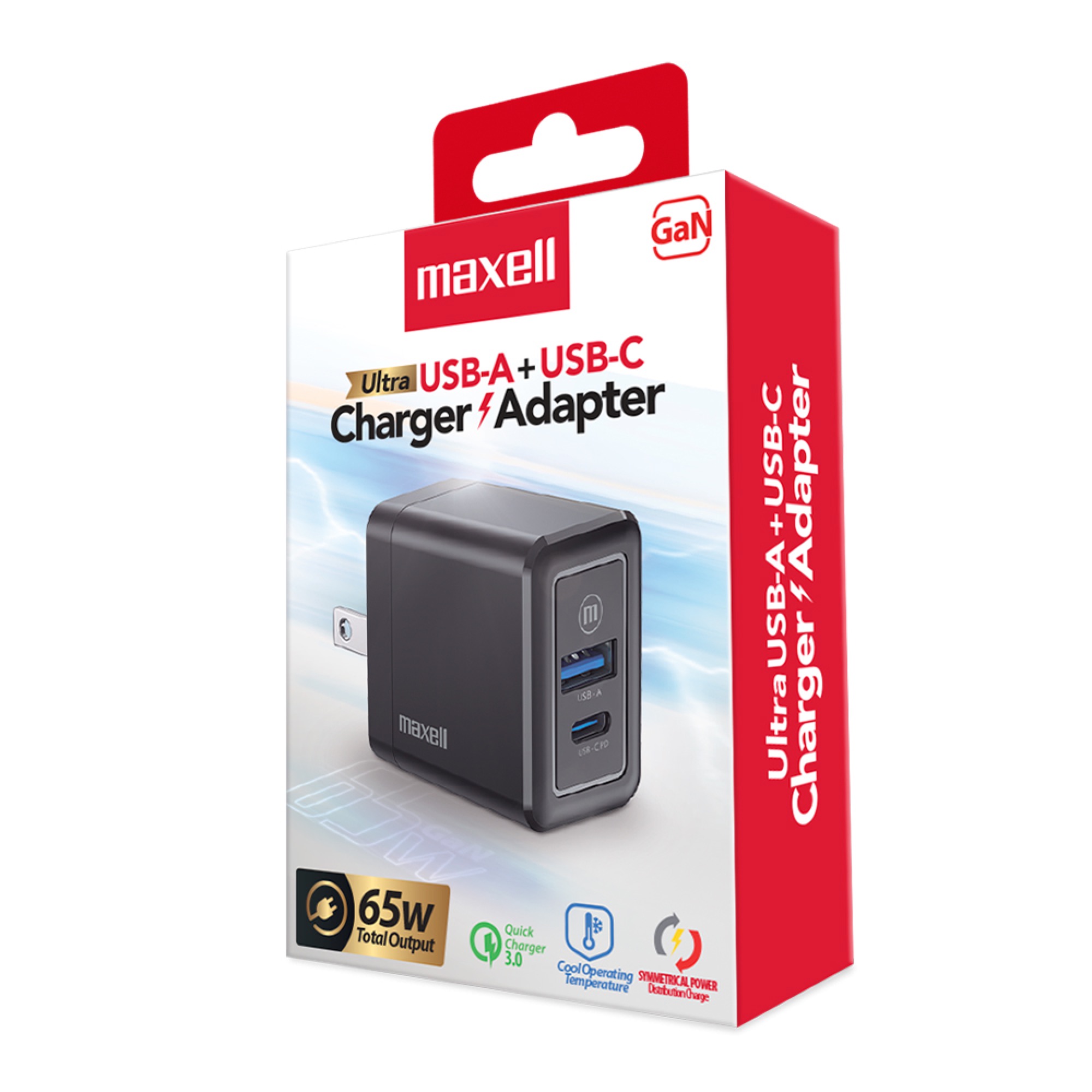 Cargado Doble Maxell USB-A+USBC Ultra Carga Rápida de 65 Watts. ESPECIFICACIONES Dos salidas: USB-C y USB-A.